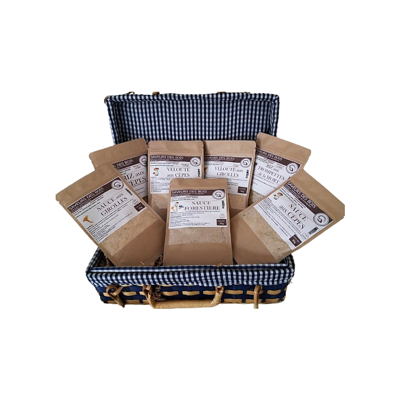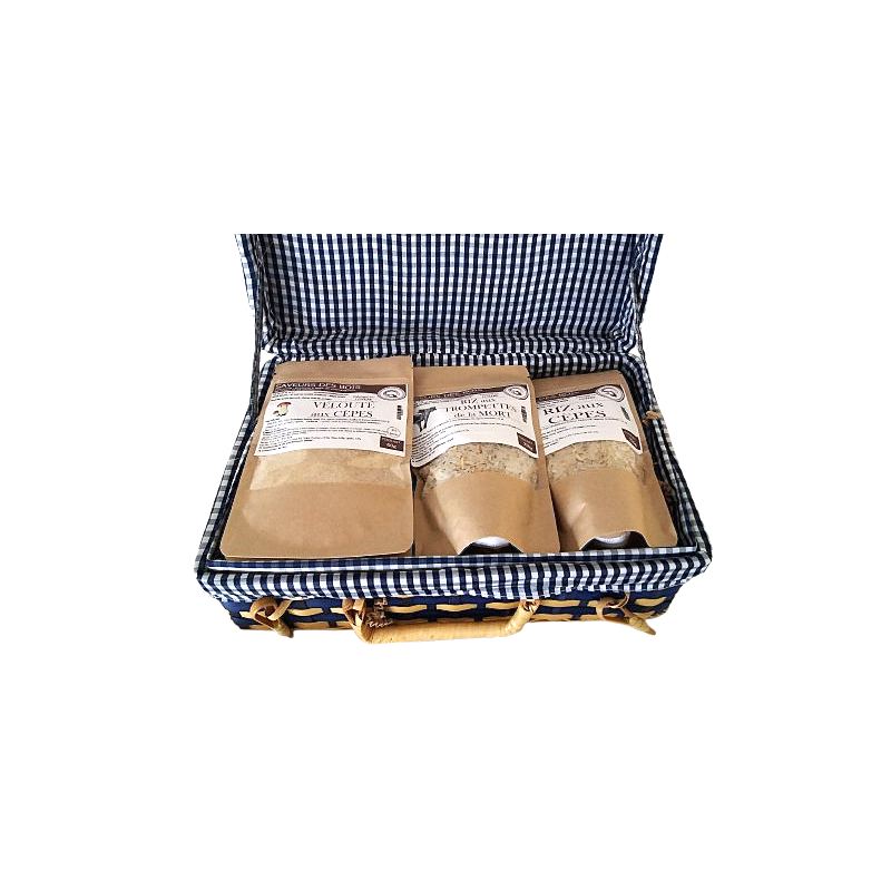 Valise bambou doublure tissu vichy, riz aromatisés, sauces et veloutés. Fabrication artisanale.