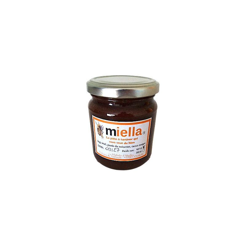 Le miella est une pâte à tartiner réalisée avec du miel toutes fleurs, de la purée de noisettes et du cacao maigre.